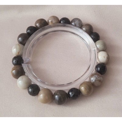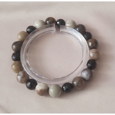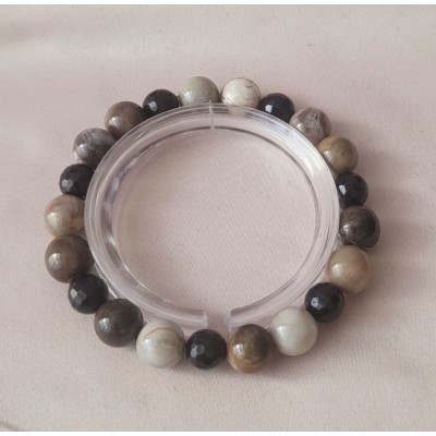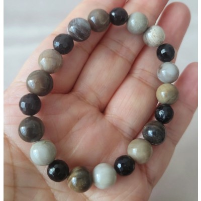 **아프리카 마다가스카르 산 규화 목( 나무 화석) 9mm 라운드 형과 투어머린 7mm라운드 컷 포인트로 만든 팔찌입니다.