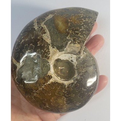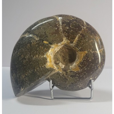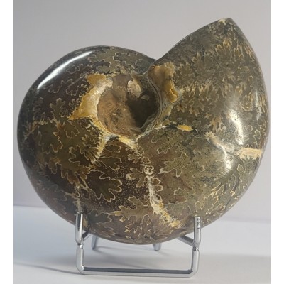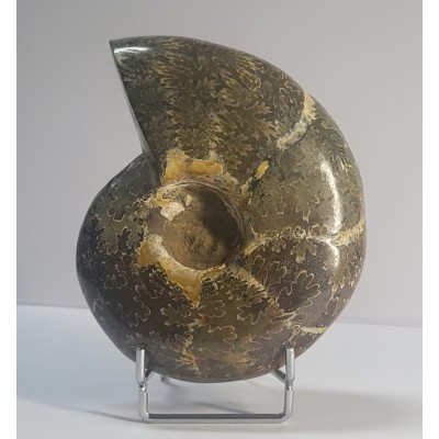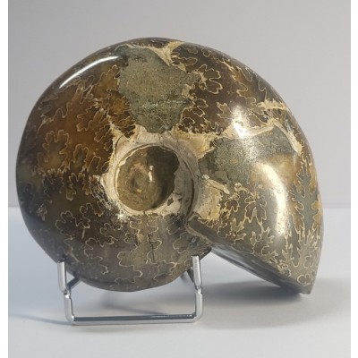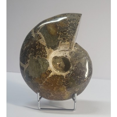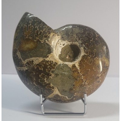 많은 부분이 칼 싸이트로 치환되어 있는 희귀 성을 가지고 있는 방해석 암모나이트입니다.