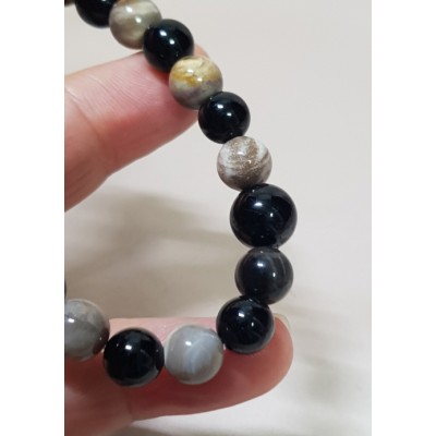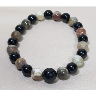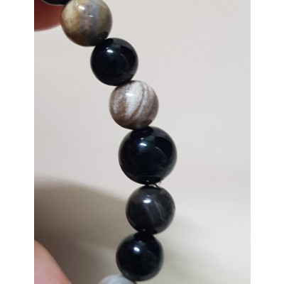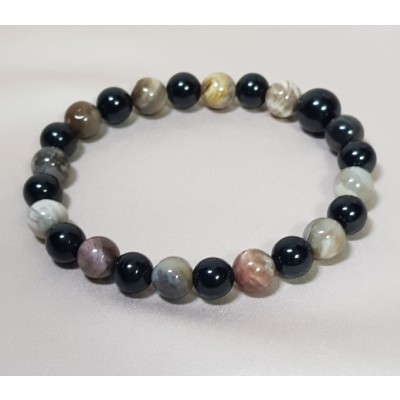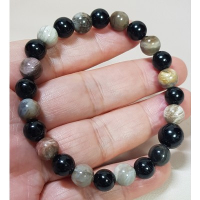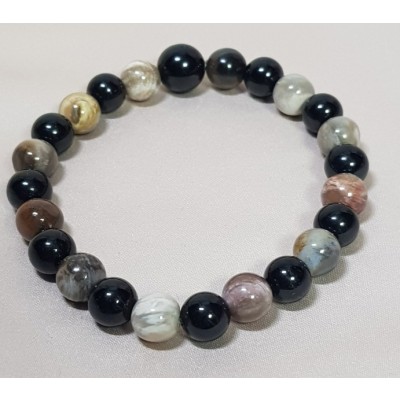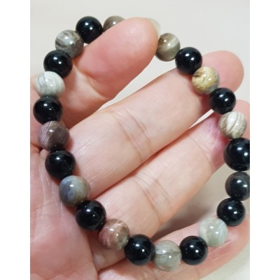 **아프리카 마다가스카르 산 블랙 투어마린과 규화목(나무화석) 으로 만든 8mm 라운드형 팔찌입니다.