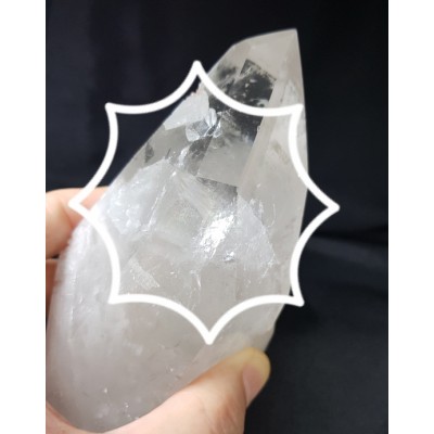 윗쪽 중간 정도에 보이는 잔금 흠결이나 육각형 모양은 다른 수정이 완전히 관입되어 있는 (바나클) 형태 입니다.