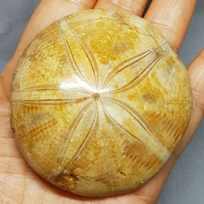 위에 올린 성게화석은 하얀색 또는 회색 바탕에 5개 내외의 꽃잎 모양 가시가 있는 둥근 형태로 실제 성게와 비슷하지만